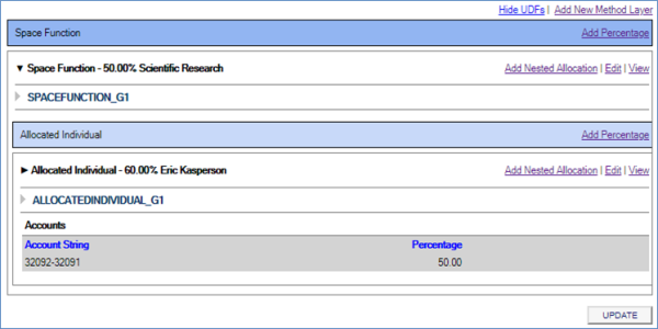 Setting this flag to Yes will cause an Accounts pane to display on the nested allocated individual method layer (instead of the space function method layer) when the complex allocation is defined. This will allow you to associate grant-specific accounts with the allocated individual allocation layer.